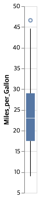 1. Tukey Box Plot은 Altair의 기본 Box Plot이다. Tukey Box Plot의 경우, 수염은 가장 작은 데이터부터 범위 내에서 가장 큰 데이터까지 [Q1 - k * IQR, Q3 + k * IQR]에 걸쳐 있으며, 여기서 Q1과 Q3는 1분위와 3분위인 반면 IQR은 사분위간 범위(Q3-Q1)이다. 이러한 유형의 상자 그림에서는 범위를 설정하여 상수 k를 지정할 수 있다. 수염 너머에 특이점이 있는 경우 점 표시를 사용하여 표시다. 기본적으로 범위는 1.5이다.