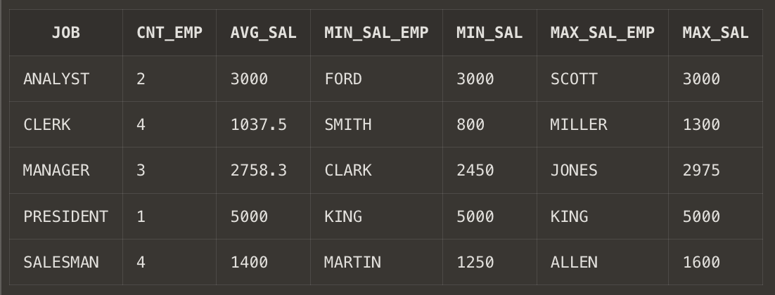 시나리오는 EMP 테이블에서 직군별로 직원수와 급여 평균, 그리고 최저, 최고 급여 값 그리고 그 최저, 최고 급여를 어느 직원이 받고 있는지 조회 하고자 한다.