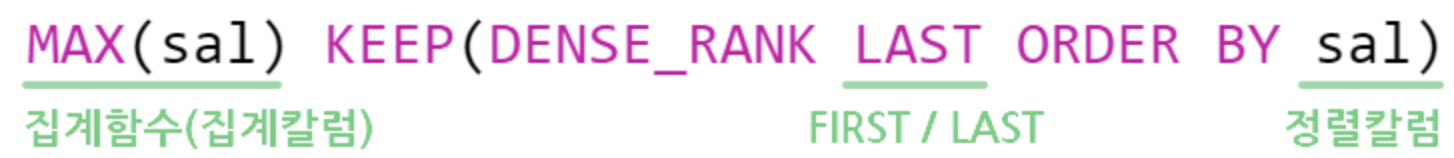 집계함수(집계 컬럼) KEEP (DENSE_RANK LAST / FIRST ORDER BY 정렬 컬럼1, 정렬 컬럼2 ,... ) - 마지막 / 첫번째 순위 값