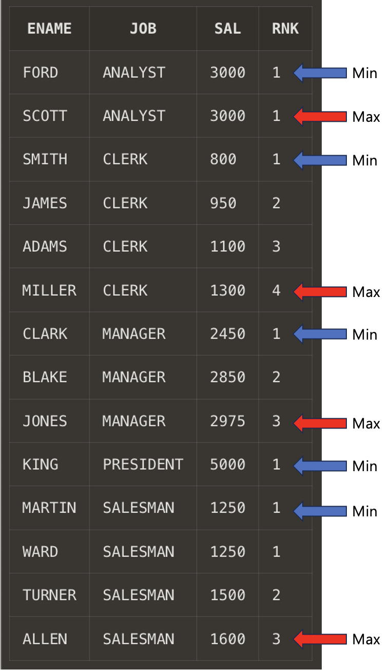 JOB이 ANALYST 인 경우 첫 순위의 행이 같은 값으로 2개이지만, 정렬에 의해 FORD가 MIN값, SCOTT이 MAX 값으로 출력된다.