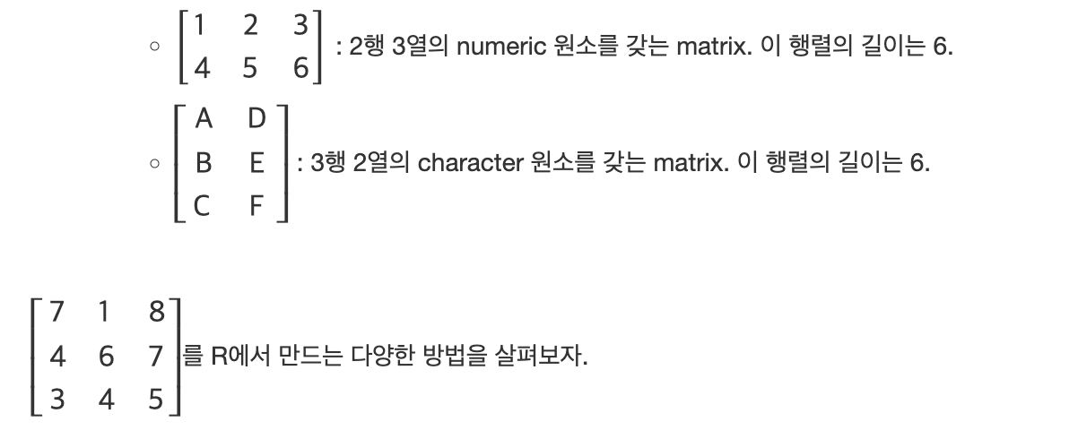 - Maxtrix는 2차원 자료구조를 가지고 있으며, 한 matrix에 속한 모든 원소는 모두 동일한 자료형을 갖는다.