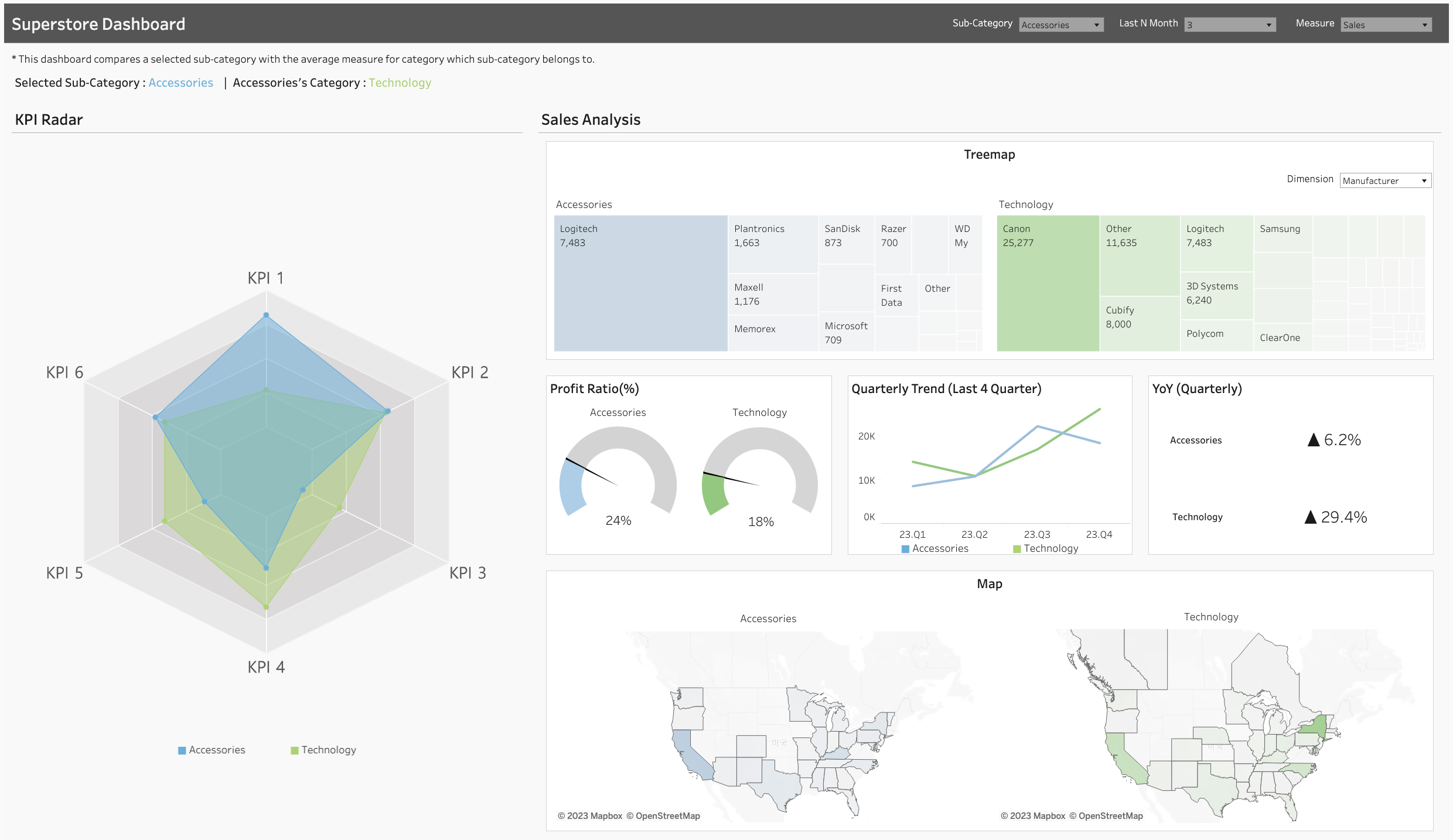 - 사용자가 필터 영역의 Sub-Category 를 선택하면 자동으로 그것이 속한 Category 값을 리턴하고 대시보드 내용이 변경됩니다.