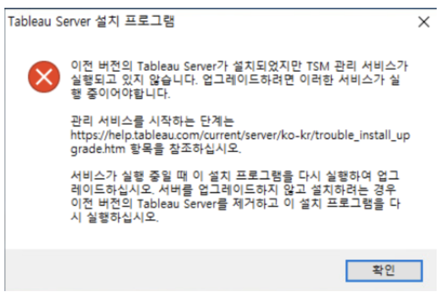 위 방법을 통해 제거 후 재설치시 아래와 같은 오류가 발생한다면 아래 방법 및 Tableau Server MSI 제거를 참조